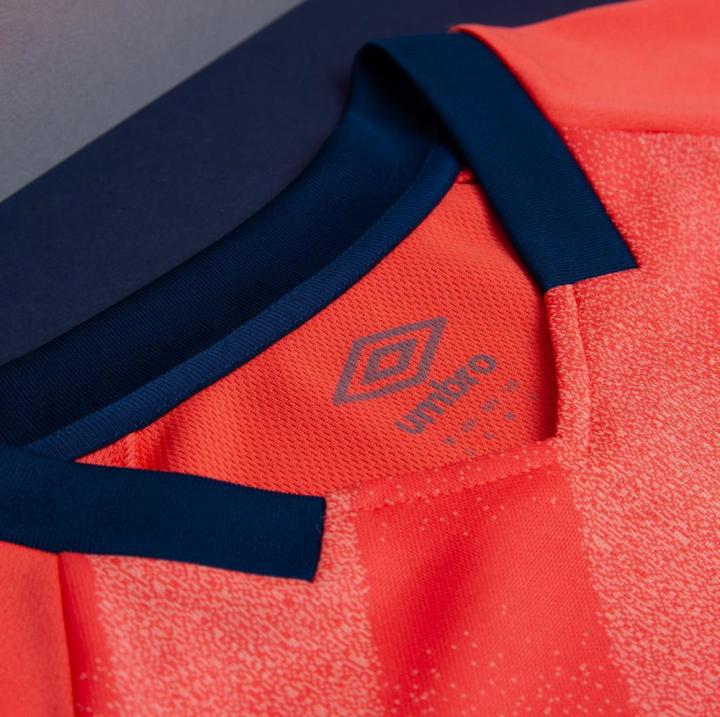蓝军蓝色V领在珊瑚色球衣的衬托下分外醒目,球衣背后衣领下方加入与主场球衣相同的“EFC”徽章,这一灵感源自于1991至1993年球衣衣袖上的徽章样式。海军蓝色球裤与珊瑚色球袜构成球队新赛季完整的客场形象,球袜上还加入海军蓝色细节装饰。