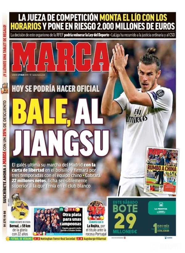 西班牙当地时间7月27日的《马卡报》以贝尔接近加盟江苏队的消息作为最为醒目的头版内容。贝尔的照片和标题占据了头版版面上很大的面积。