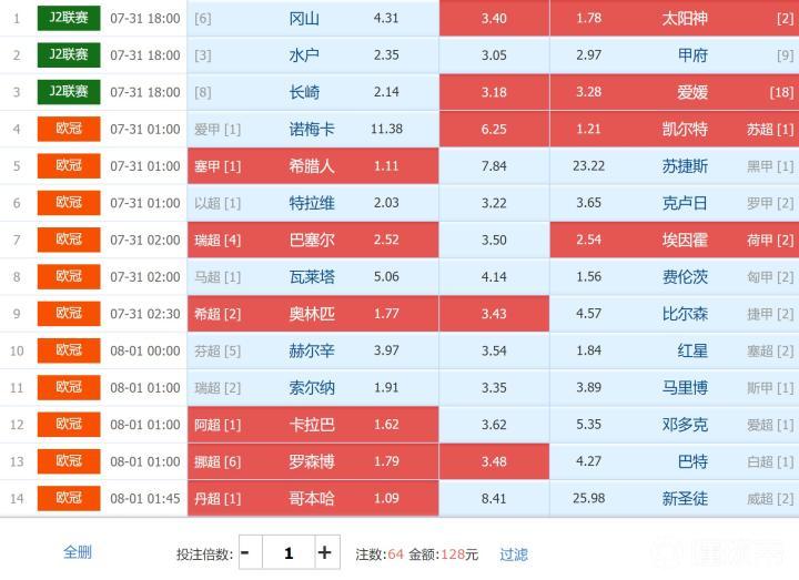 本期任九赛事组合为日乙+欧冠,停售时间为7月30日21点45分,比赛时间跨度为两天,精选三胆六双方案供广大彩民参考,投注有风险,希望能给大家带来红单。