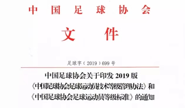 7月26日,中国足协广泛征求各会员协会、全国校园足球办公室和教育部学生体育联合会意见,正式发布了《中国足球协会足球运动员技术等级管理办法》(2019版)、《中国足球协会足球运动员技术等级标准》 (2019版)。