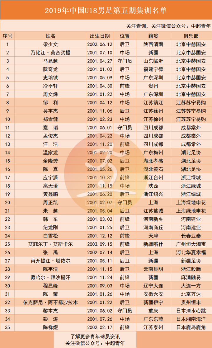 本期集训名单共35人,北京中赫国安7人,江苏苏宁、浙江绿城、湖北足协、成都棠外各3人。