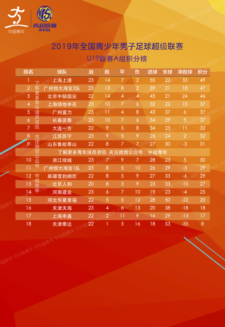 青超U19联赛A组积分榜(截至第23轮):