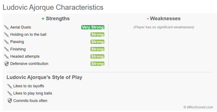 阿若克的头球能力自然也是一大优势,身高197cm的法国巨无霸,屡屡接到拉拉或者托马松来自右路的美妙传中,完成泰山压顶般的破门。阿若克场均能够贡献4.2次争顶成功,无论是正面攻击球门还是回做给守在第二点准备前插的队友,阿若克都得心应手。