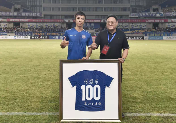 7月27日,在中乙第21轮昆山FC客场2-0战胜南京沙叶河海的比赛中,张煜东身披昆山FC战袍完成了他个人职业联赛的百场里程碑之战。8月3日回到主场的比赛中,俱乐部也特地为张煜东举办了百场纪念仪式。现场的DJ说了一句话:“希望张煜东未来能够完成代表昆山FC的第100场比赛。”