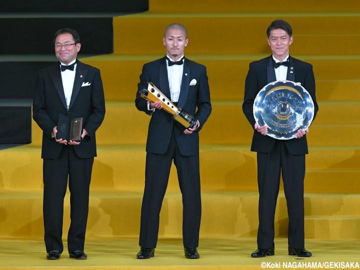 拿到球队J2首冠的功臣(从左至右):主教练反町康治、前锋前田大然、后卫田中隼磨