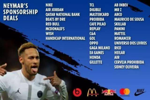 内马尔拥有百分百的肖像权,这些钱全进了自己口袋。《福布斯》称,2018年,内马尔有35份赞助或代言合同,收益近2000万欧元。《每日邮报》则表示,C罗自成为职业球员后,靠代言和与赞助商合作,已赚到超20亿美元。