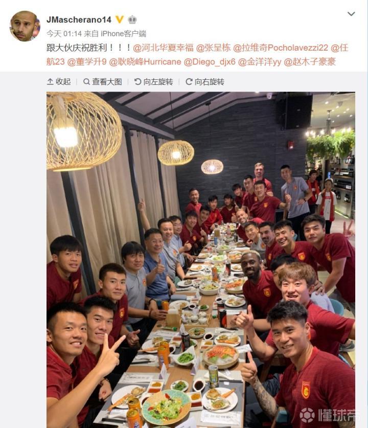 马斯切拉诺微博晒照与队友聚餐,庆祝球队逆转取胜解成_SneakerHead @懂球帝2019-08-15 14:22中超第22轮,在2-1逆转战胜北京人和后,河北中场马斯切拉诺微博晒与队友一起聚餐的照片,庆祝比赛的胜利。本场比赛河北在客场先丢一球的情况下,由拉维奇和董学升各入一球帮助球队逆转取胜,值得一提的是拉维奇所罚入的点球正是由小马哥创造的。本赛季马斯切拉诺各项赛事出场出场22次且全部为首发,为球队贡献了5个助攻。展开更多