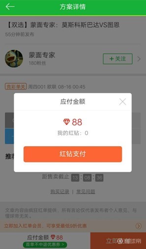 在专家方案或大数据锦囊详情页,点击“立即支付”,会弹出红钻支付窗口,这里能看到要支付的红钻数和你剩余的红钻数,点击“红钻支付”就可以进行相应支付啦,如果红钻不足,则会自动跳转到红钻充值页面。