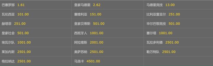 2019-2020赛季西甲联赛将于本周五正式拉开大幕,机构也即时更新了最新的西甲夺冠赔率。巴塞罗那毫无悬念的以1赔1.61高居榜首,皇家马德里以1赔2.62暂居第二,马德里竞技虽然排名第三,但夺冠赔率仅为1赔13.00。单从赔率来看本赛季很有可能回到皇马巴萨争冠的局面。