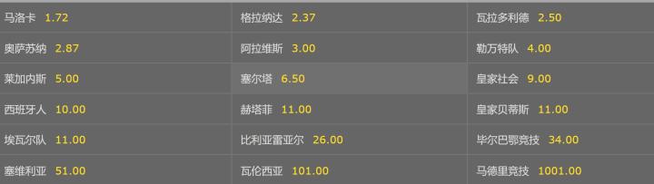 本赛季西甲降级球队方面,升班马马洛卡排名第一,降级赔率为1赔1.72,同为升班马的格拉纳达排名第二,降级赔率为1赔2.37,上赛季西甲排名第17的瓦拉多利德排名第三降级赔率是1赔2.50。