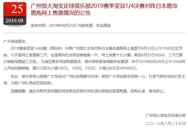 公告里写道:“2019赛季亚冠1/4决赛(首回合)中国广州恒大主场对阵日本鹿岛鹿角网上售票于8月23日上午10:00正式开始,今天是网上售票第三天,也是面向社会球迷销售第一天,网上抢票十分火爆。截至8月25日20:00,三天已累计销售球票超三万张。 为满足更多球迷购票需求,俱乐部特紧急调集所有票源,将于2019年8月26日上午10:00网上开始加推销售,票价分别为少量100元、150元、250元、少量300元及VIP500元。在此,俱乐部衷心感谢广大球迷对广州队的厚爱与支持!期待广大球迷朋友同袍一心,打造气势恢宏的红色主场,力助广州队再创亚冠佳绩。 ”