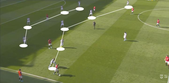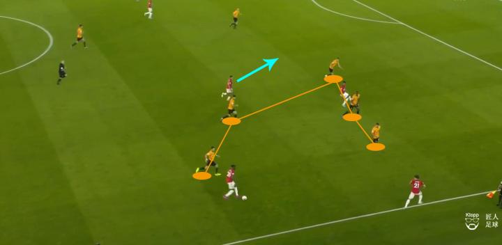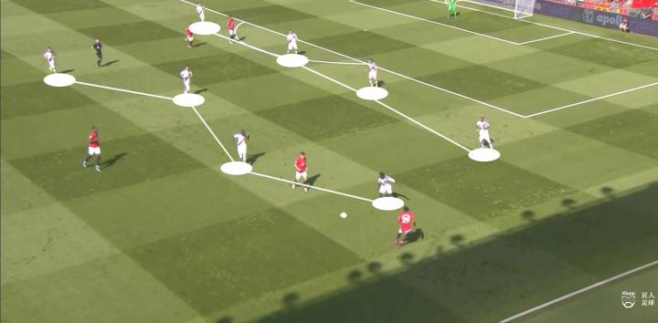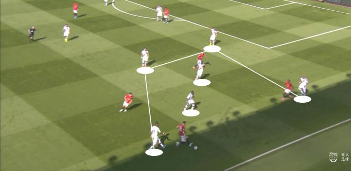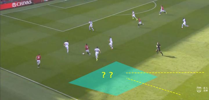 例如上图中的进攻,曼联两名速度型球员拉什福德和丹尼尔·詹姆斯正在冲击水晶宫的边路后防,但不难发现,他们身后并没有队友跟进,此时原本应该有左后卫阿什利·杨,又或者是中场的麦克托米奈跟上,一旦前场队友推进时被水晶宫后卫断球,也可以保护第二点以保持控球,维持进攻。但在这一次进攻中,当水晶宫后卫形成断球后,曼联没有队友跟进,若不是对方传球失误,他们将会在中场球员回防不及的情况下,面临对方的快速反击。