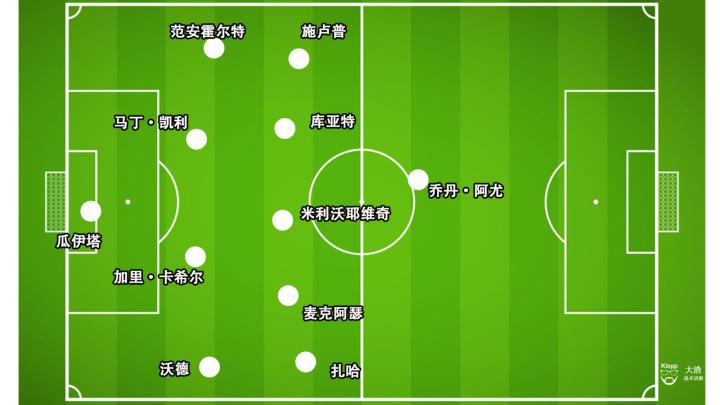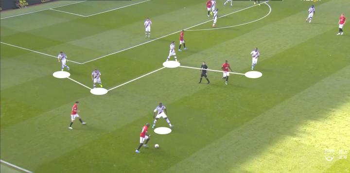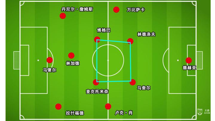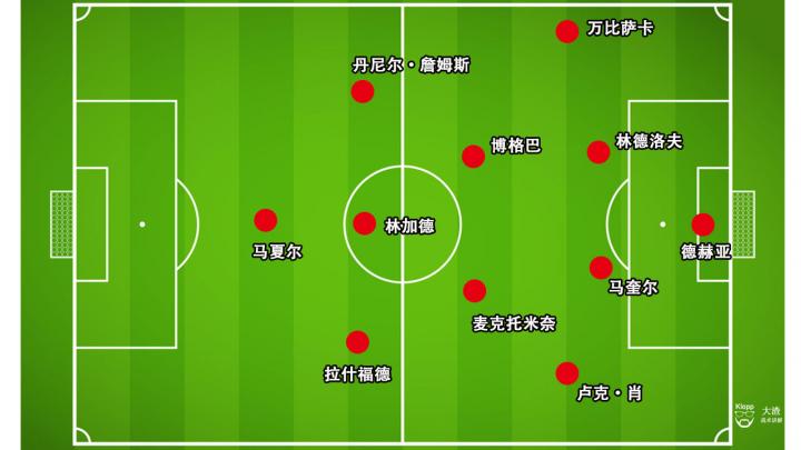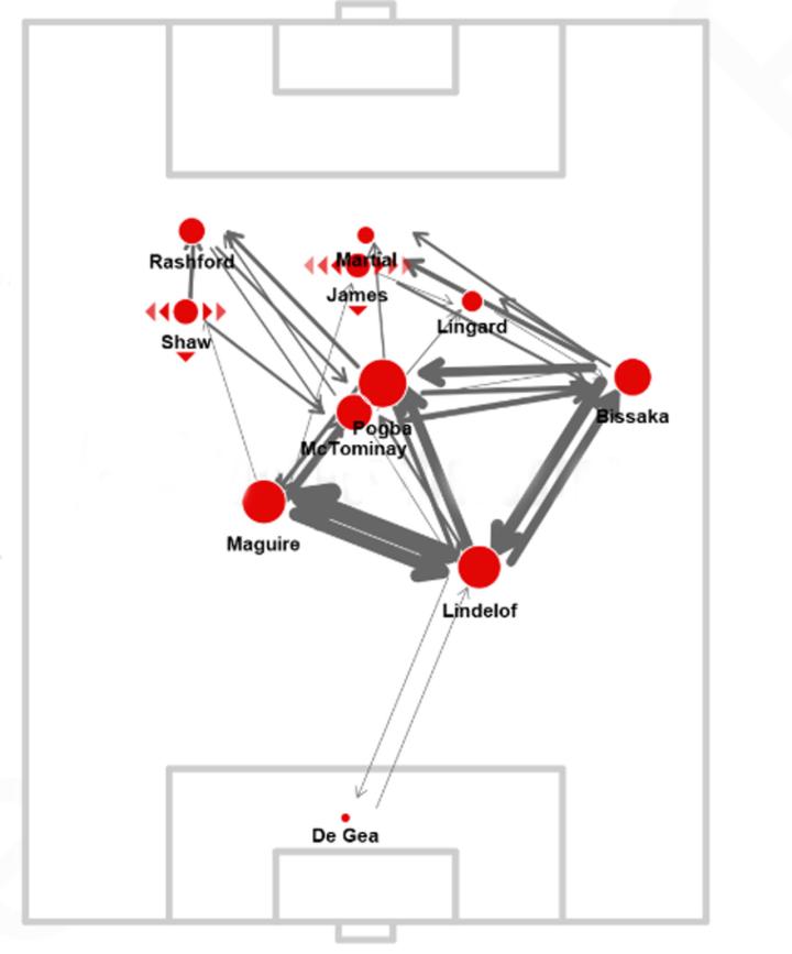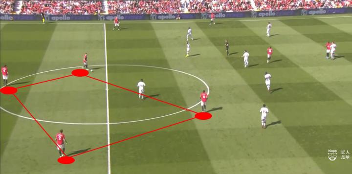 整场比赛下来,曼联队在控球百分比上高达71%,场面尽占优势。鉴于对手整体回缩的阵型,曼联在中圈位置形成哈利·马奎尔、麦克托米奈、博格巴与林德洛夫的四人组合,牢牢控制中场中路的区域。