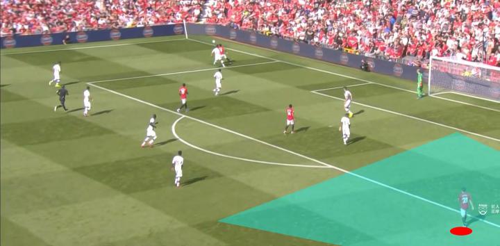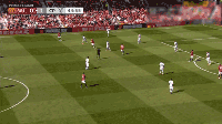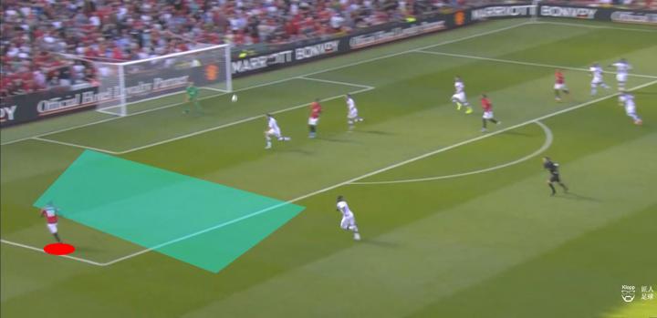 换边后,原本处于弱侧的曼联球员持球进攻,而此时水晶宫4-4-2阵型的整体移动仍需要时间,曼联于边路获得了快速推进的空间,快速下底传中,或者倒三角传至禁区开外。