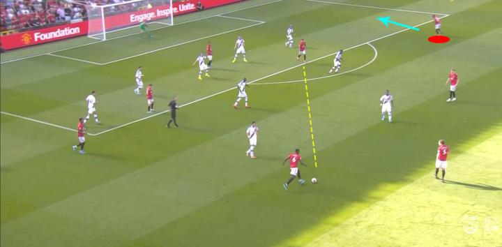 当皮球来到中圈位置,通常有博格巴或者麦克托米奈两名防守中场负责分球到边路。此时,强侧的边后卫将会往前压上,参与到球队边路的进攻当中,而从最近的比赛来看,曼联的边路进攻更多地是在右路。