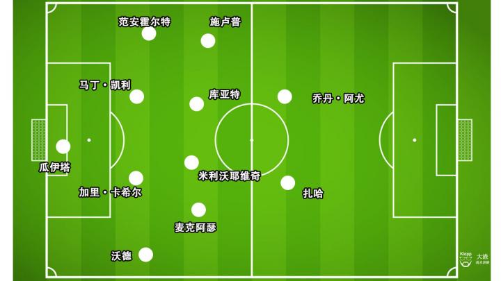 从曼联的首发阵容来看,索尔斯克亚的教练团队于本场比赛的战术取态,与上一场对阵狼队时候基本一致,以博格巴和麦克托米奈双防守中场控制中场中路区域,作为分球至边路的桥接点,利用前场球员的奔跑速度冲击对方后防线,下底传中至禁区内抢点,以及于禁区外由中路后上的球员保护进攻第二点。