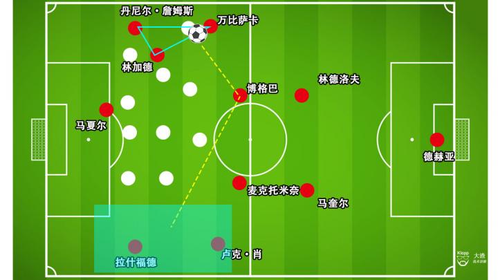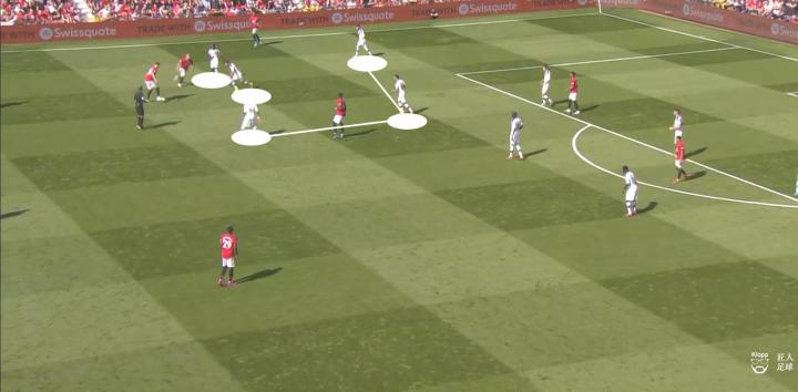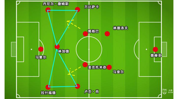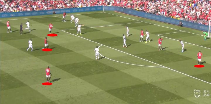 首先,曼联从后场组织的时候,快速压过半场,中场球员博格巴与麦克托米奈负责分边,将曼联的进攻火力推进到边路。