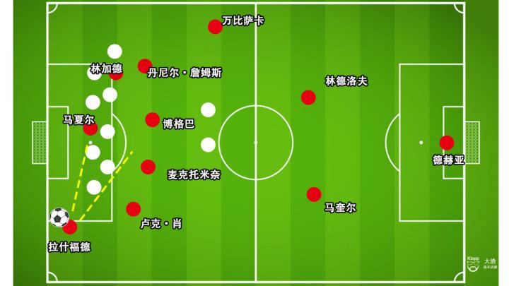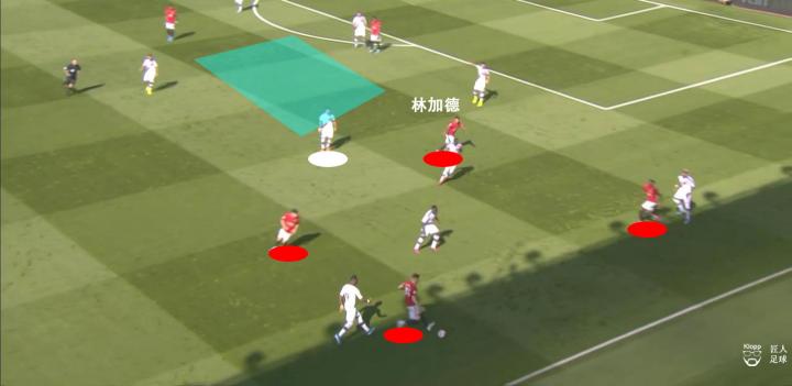 上文也提及到,水晶宫本场比赛4-4-2的低位防守阵型,其后卫线对于横向覆盖的宽度不足,曼联频繁通过换边获得弱侧球员的突破空间,本场比赛曼联边路下底传中的机会也增多。加上林加德频繁从中路跑向边路协助进攻强侧,牵走对方一名中路防守球员,当曼联于禁区内的抢点被水晶宫守卫解围时,后上的队友常常能以人数优势抢得进攻第二点。所以可以看到本场比赛曼联在大禁区外的区域有较多的起脚机会,这一现象的形成大致分以下几个步骤进行。