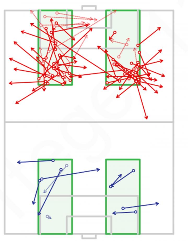 此时,不管是弱侧的曼联队员,或者是大禁区外伺机埋伏的后上队员,都将获得抢点射门的机会,即使禁区内有水晶宫的防守球员解围,曼联也可以在大禁区外较为轻松地抢到第二点,持续地进攻。所以不难理解曼联在本场比赛的进攻三区辅位位置,他们向边路传球的次数非常多,而大禁区弧顶附近位置的起脚射门次数也多达8次。