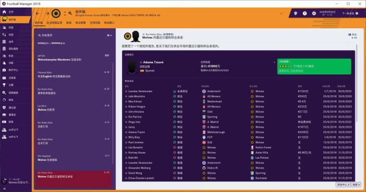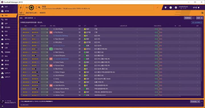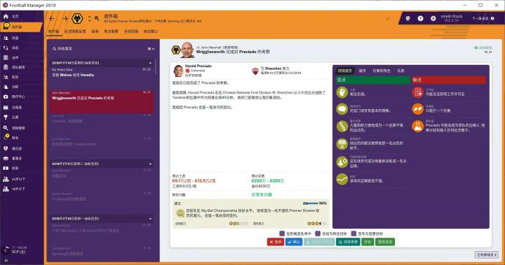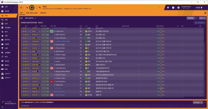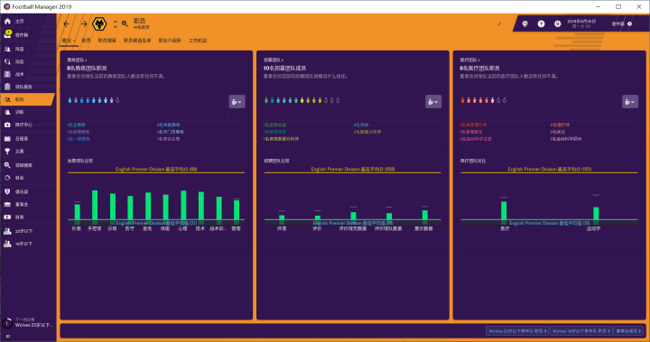 19版的FM在职员方面做出了很多改动,从图中我们可以看到,以前的招募团队只有三种职业:总监、首席球探、球探,现在多了一个数据分析师的职业。这个数据分析师是干啥的,我现在也不知道。医疗团队以前只有医生、现在还出现了理疗师、运动科学主管、运动科学顾问。这几个职业是干嘛的,我同样不知道。在之后游戏中使用相关人员的时候,我再给大家一一介绍。现在我的主要工作就是补全球队的职员,能补全就好,不打算做大规模的更换。毕竟,这些职员还都挺不错,狼队确实有成为一个大球队的趋势啊。