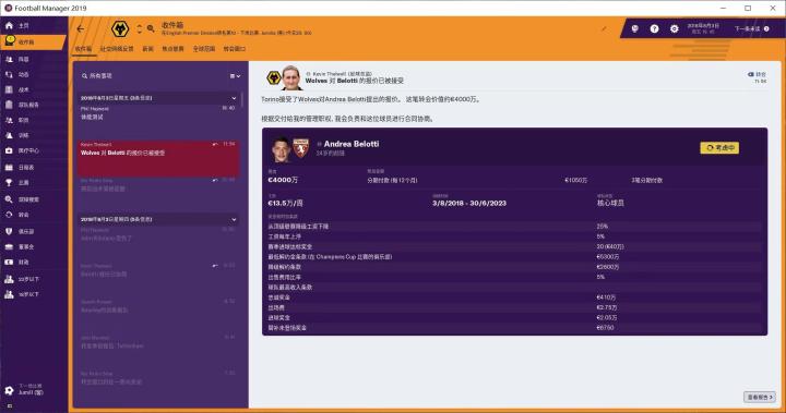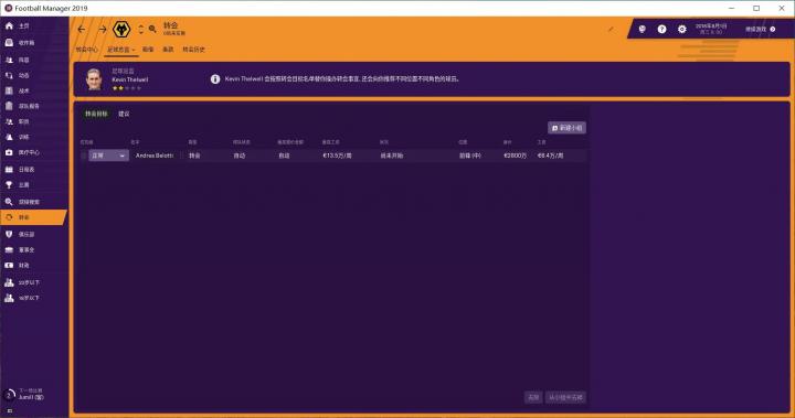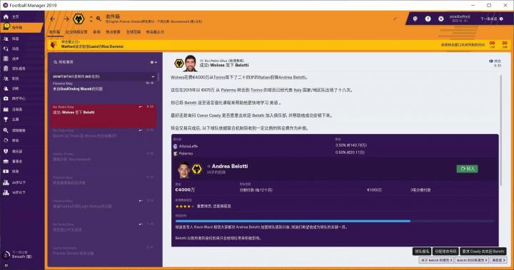 我的球探团队一直没给我找到心仪的中后卫,反倒是给我推荐了一个前锋——都灵前锋贝洛蒂。身价、周薪都合适,果断开价买来。这也就意味着我这个转会窗不会再有其他重磅引援了,看看下个赛季能不能买来一个优秀中后卫。