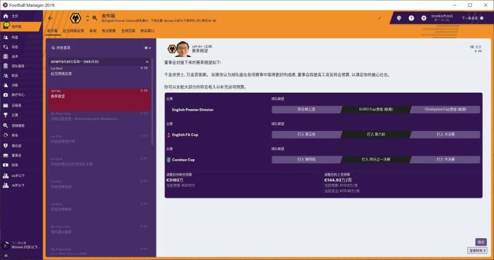 本赛季我的主要的目标是进入欧联杯,保住欧联杯参赛资格。我的计划是这样的,打算通过三、四个赛季的时间增加球队阵容厚度,让狼队成为英超big7。要完成这样的目标,保证球队持续参加欧联杯是必不可少的,也是至关重要的。打欧联杯可以增加球队关注度,获得奖金,保证球队拥有良好的经营状况。至于剩下的足总杯、以及卡拉宝杯(联赛杯),其实并不是很重要。