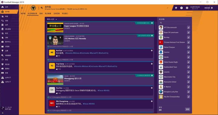 FM2019增加了社交网络反馈系统,可以看到右边可以选择关注的人,左边是关于这些人的一些新闻,点开还可以查看详情。比如说别的球队像租借我的年轻球员,我如果不知道该怎么办,就可以点开社交网络看看大家怎么说,下面有一个人说有点道理、一个人说有更好的选择,你就可以点开看看,想想是否要租借给这个球队。