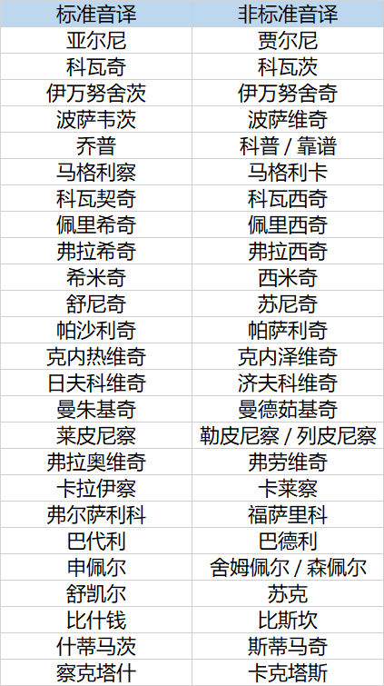 最后给大家留个小测试,前利物浦后防大将比斯坎(Bišćan)、德比郡名宿斯蒂马奇(Štimac)以及哈伊杜克中场卡克塔斯(Caktaš)三名球员的名字的准确音译应该是什么呢?答案在最后的附表末尾。