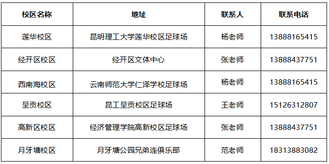 随着培训班体验课的开班,昆陆2019秋季招生也拉开帷幕,除了五华区(昆工莲华)校区训练点以外,包括经开区校区、南市区(西南海)校区、呈贡校区、高新校区、北市区(月牙塘)校区在内六个校区也同步启动秋季学期授课招生,昆陆将以最专业的青训教练作为指导。