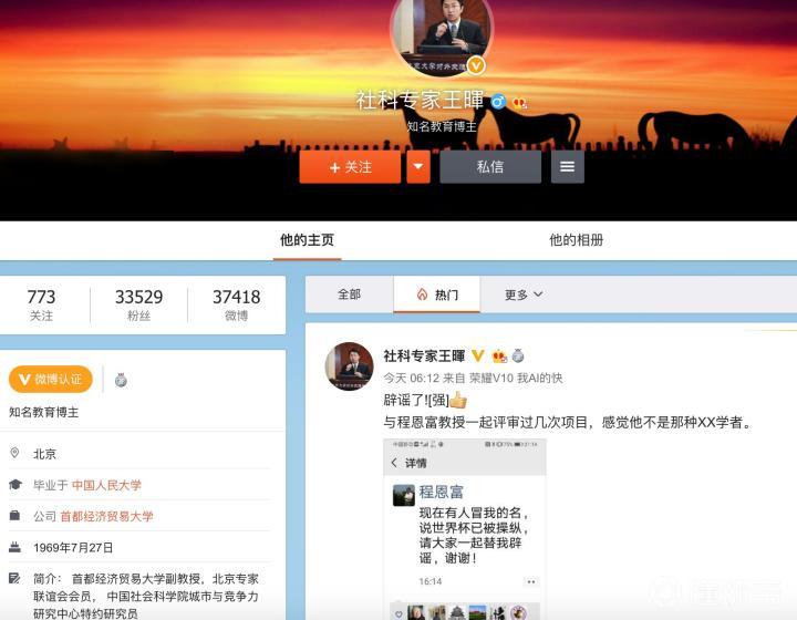 微博名“社科专家王暉”的博主今天对此进行辟谣,他在微博转发了程恩富的朋友圈,程恩富表示有人冒用他的名字,请大家一起帮他辟谣。不过截止目前,这条微博只有8个转发,点赞、评论寥寥,但是谣言在微博的转发和评论却非常多。