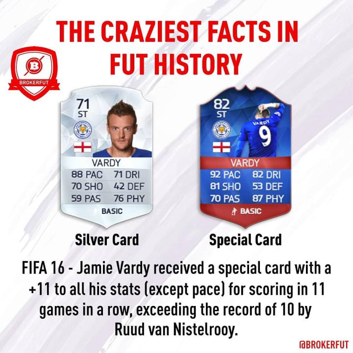 (图)注意看,瓦尔迪这张卡除了速度之外各大项能力值都加了11点,对应的就是他连续11场进球