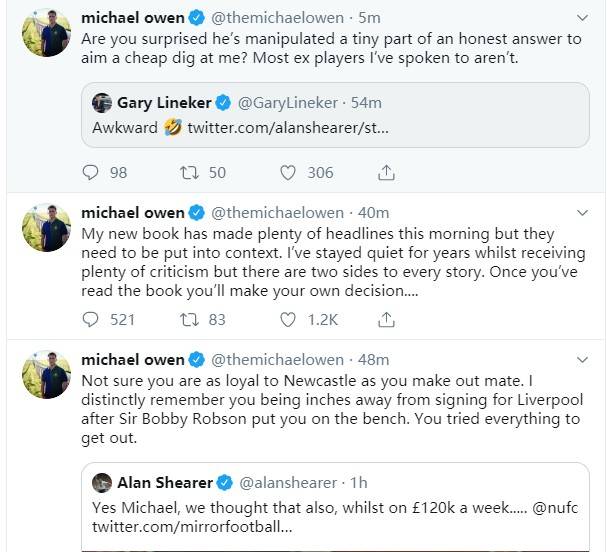 欧文也不甘示弱,直接就怼回去:“我不确定你是不是像外界认为的那样,对纽卡斯尔那么忠诚。我记得罗布森爵士把你放在替补席时,你就差点转会加盟到利物浦,你用尽所有方法争取离队”。