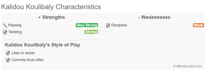 防守能力:库利巴利的防守能力可以说是世界级的,他的卡位能力非常强,在当今足坛的中卫里可以说是数一数二的,塞内加尔人的力量出色,善于一对一限制,当对手正面拿球尝试过人的时候,库利巴利总是能完成精彩的断球。
