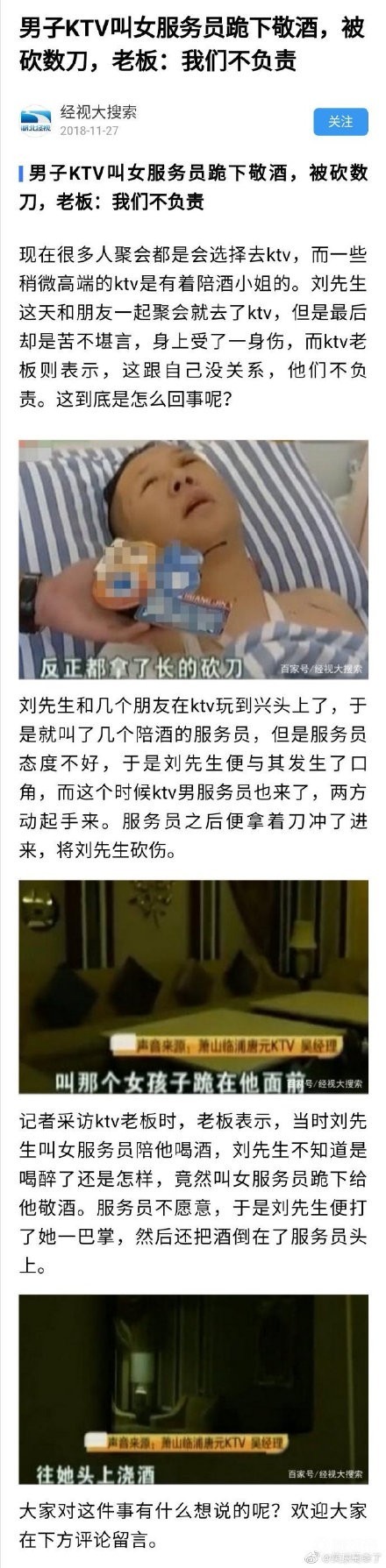 男子KTV叫女服务员下跪敬酒,被砍数刀 老板:我们不负责益达与绿箭 @懂球帝2019-09-05 15:17男子KTV叫女服务员跪下敬酒,服务员拒绝下跪,男子觉得很没面子遂殴打服务员并将酒水浇到女服务员头上。随后该女服务员出门后便喊了一群人围堵陈先生一行人就行报复,并最终将其砍进了医院。陈先生表示自己确实有做的不对的地方,但大家可以坐下来讲道理,没必要拿刀追砍。KTV老板:我们不负责…展开更多