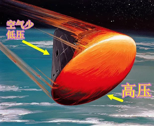 如上图,飞船在返回地球大气层时,由于速度极高,飞船前方与大气剧烈冲撞,压力极高,反过来呢,后方的空间,压力很小,这是因为飞船高速下落时会排开空气,后方空气少了,压力当然就小了。而后方压力小会产生一种抽吸的力。