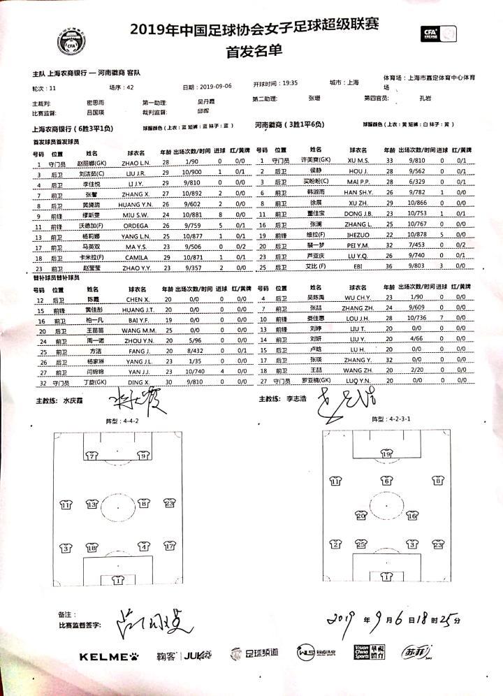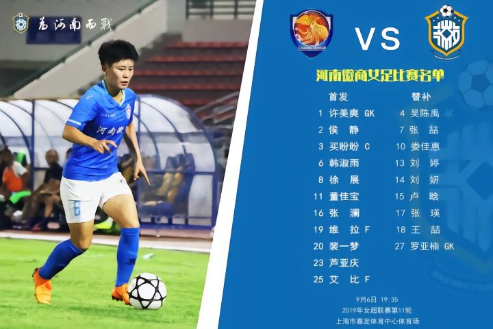 2019中国足球协会女子足球超级联赛第11轮,上海农商银行女足坐镇主场迎战河南徽商女足,双方首发及替补阵容名单!