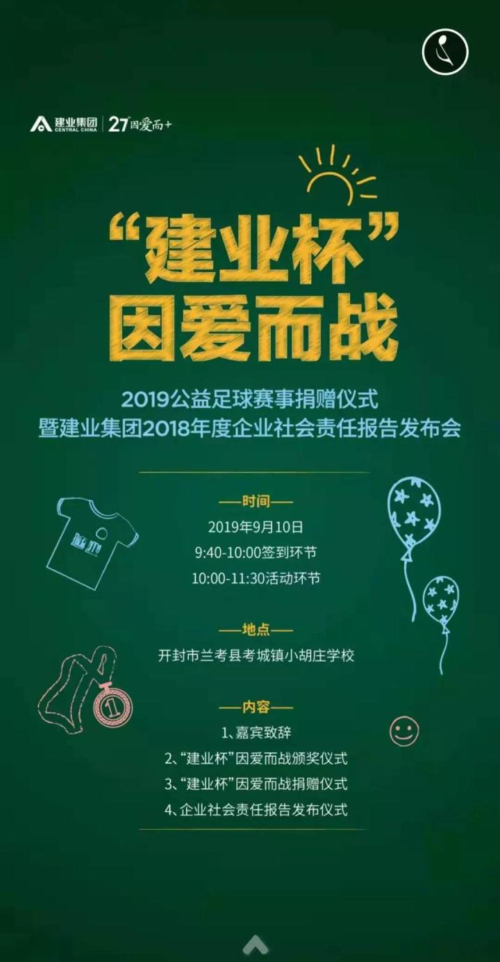 因爱而战,助梦启航。按照“足球+公益”的赛事初衷,“建业杯”因爱而战2019公益足球赛事捐赠仪式将于9月10日10:00在首批受捐学校之一的兰考县考城镇小胡庄小学举行,结合各区域参赛队成绩及学校实地考察情况,入选“建业杯”爱心球场、足球师资及足球装备受捐学校名单的40所农村中小学也将全部揭晓。9月10日,开封兰考,让我们一起用爱心点燃足球梦!