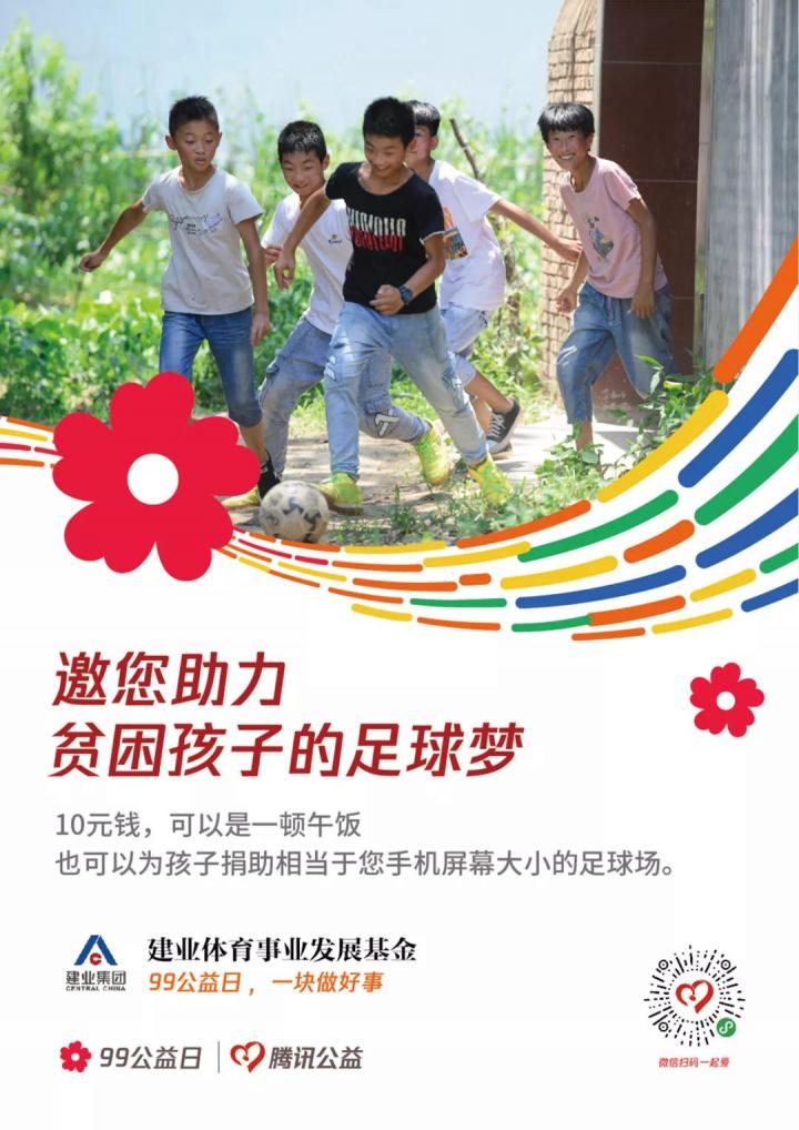 截至9月7日晚,建业体育事业发展基金发起的“贫困孩子的足球梦”项目已募集到近10万元善款。9月7日—9日,您捐一块钱,建业配捐四块,还会获得腾讯公益随机配捐,爱心能量持续加倍中。让我们一起做公益(扫码),共筑足球梦!
