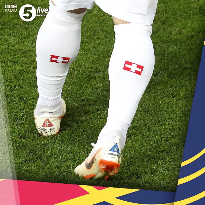 ▲沙奇里曾在比赛中穿着特殊球鞋,一只绣有瑞士国旗,另一只则是科索沃国旗。