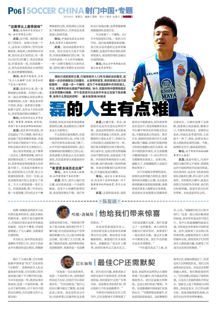 武磊:我是中国人,代表中国队比赛自然义不容辞。即使我会在中国和西班牙间来回奔波,但在国内时,也会坐飞机参加国家队的训练和比赛,所以这没什么特别的。在国家队比赛中,就是应该努力为国家争夺荣誉。
