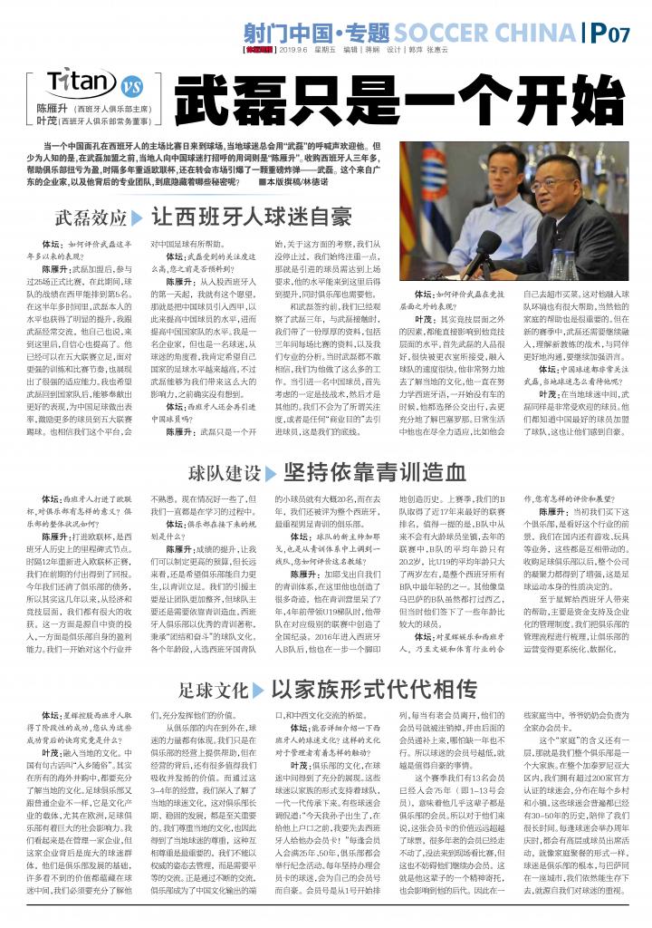 陈雁升:从入股西班牙人的第一天起,我就有这个愿望,那就是把中国球员引入西甲,以此来提高中国球员的水平,进而提高中国国家队的水平。我是一名企业家,但也是一名球迷,从球迷的角度看,我肯定希望自己国家的足球水平越来越高。不过武磊能够为我们带来这么大的影响力,之前确实没有想到。