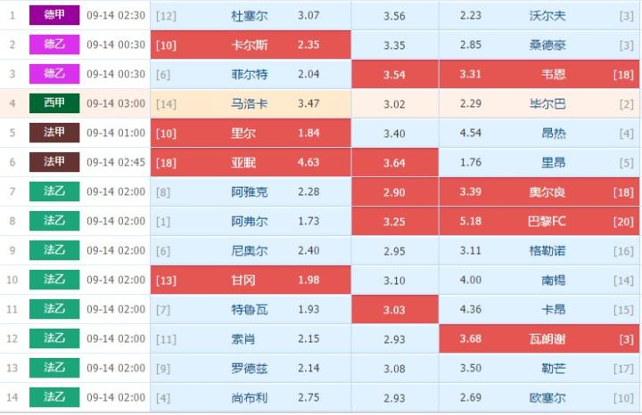 鸽子首先淘汰场次1杜塞尔多夫vs沃尔夫斯堡,场次4马洛卡vs毕尔巴鄂竞技这场比赛,理由有二:一是自我判断能力对于法国联赛的赛事更加自信,二是这两场相对其它赛事偏热门。其次鸽子将场次14尚布利vs欧赛尔的赛事剔出,版型为222,回报数值太过均等,难度大。最后鸽子将场次9尼奥尔vs格勒诺布和场次13罗德兹vs勒芒的比赛也排除在外,理由与场次14类似,难度偏大,就算分析完需要防范的结果也有两项,增加资金成本和时间成本,索性放弃。留下九场比赛逐一分析,再做最终决定。