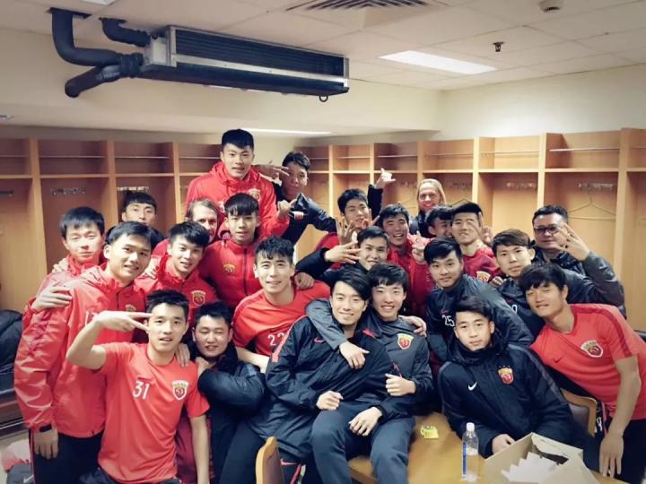 蔡惠强(一排左三黑衣)在赛后更衣室与上港小队员们的合影