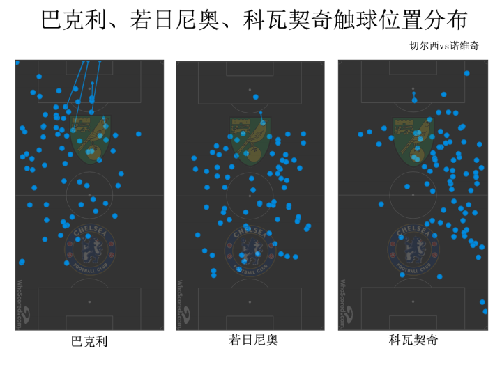 与诺维奇的比赛,中场三人组的拿球次数基本相同,巴克利还获得了4次射门机会;而对阵谢菲联时,巴克利出现在前腰位置,触球次数、射门次数却大幅下降。这是因为巴克利和科瓦契奇双双出现在肋部时,前场的攻击人数实际达到了5人,两人在肋部施加压力,让拖后的若日尼奥能发挥自身特长;而巴克利出现在前腰位置,反而影响到科瓦契奇在前场的活动,没有科瓦契奇的牵制,巴克利也难以获得更多的空间。