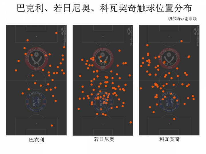 (图)与战胜诺维奇的比赛相比,对阵谢菲联时切尔西进攻质量严重下滑,关键原因是巴克利、科瓦契奇在肋部的拿球次数出现大幅下降