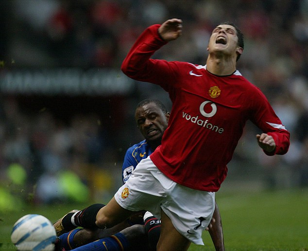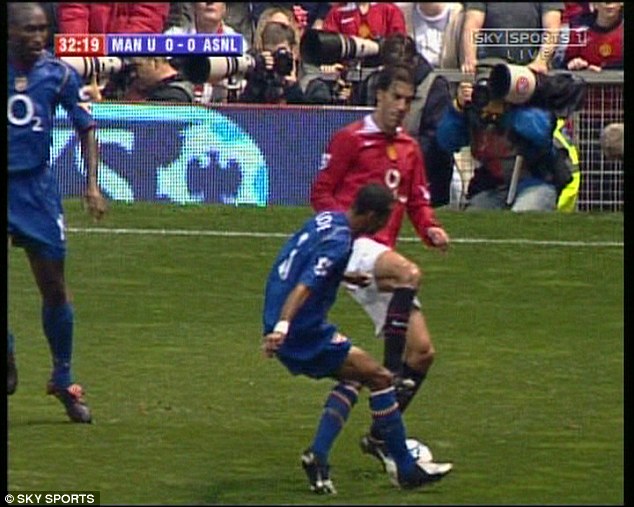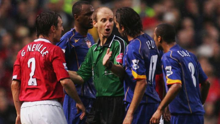 不久后,加里-内维尔对雷耶斯做出了一个非常恶劣的铲球,然而这一次莱利还是没有掏牌。而场边的温格已经在冷冷的冰雨中不敢相信地摇着头。维埃拉粗野放倒C罗又让莱利陷入了双方球员短暂的包围之中。之后范尼在右边路接到内维尔的界外球时停球稍微有些大,阿什利-科尔回身断球,荷兰人一脚踩在了科尔的膝盖上,后者痛苦地倒地翻滚,不得不下场接受治疗。然而这时比赛才进行到第30分钟。