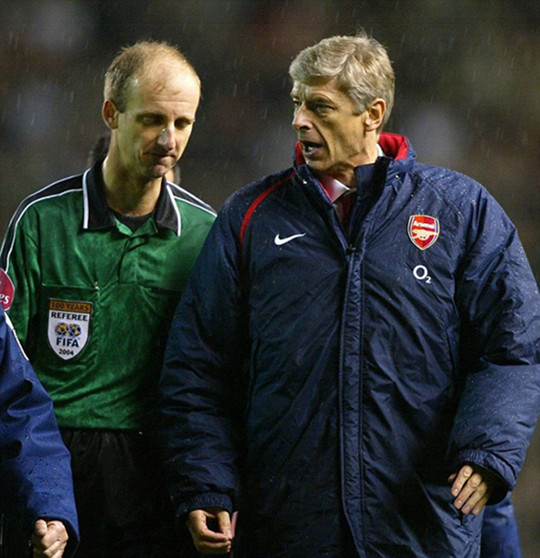 斯蒂文-贝内特执法了2003年9月那场两队之间的那场对抗,然而这一次将是迈克-莱利——英格兰的2004年欧洲最佳裁判——他将成为这场大战的主角之一。在赛前,莱利的上级基斯-哈克特(裁判委员会主席)如此形容这位来自约克郡的主裁判:“冷静,在需要时表现强硬并且永远不会情绪过激”,然后补充道:“你想要的裁判会像一名优秀的管弦乐队指挥那样,手握指挥杖,控制正常节奏。”然而,比赛结束后,温格脑子里唯一的想法或许就是退了这张该死的音乐会门票。