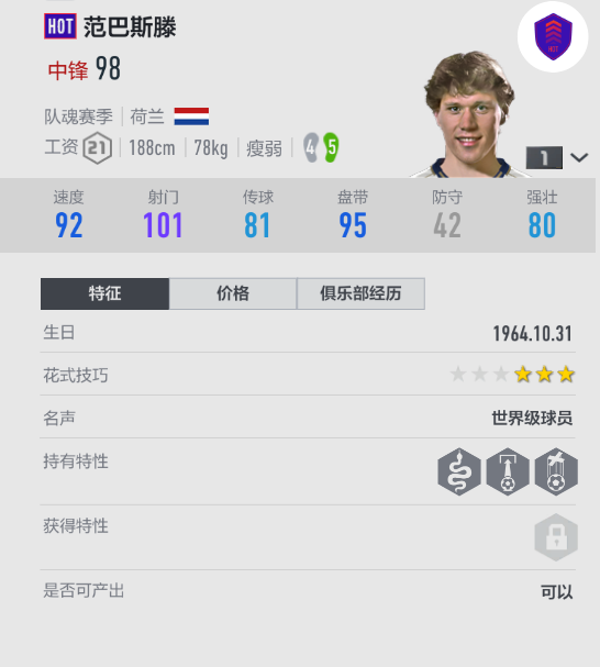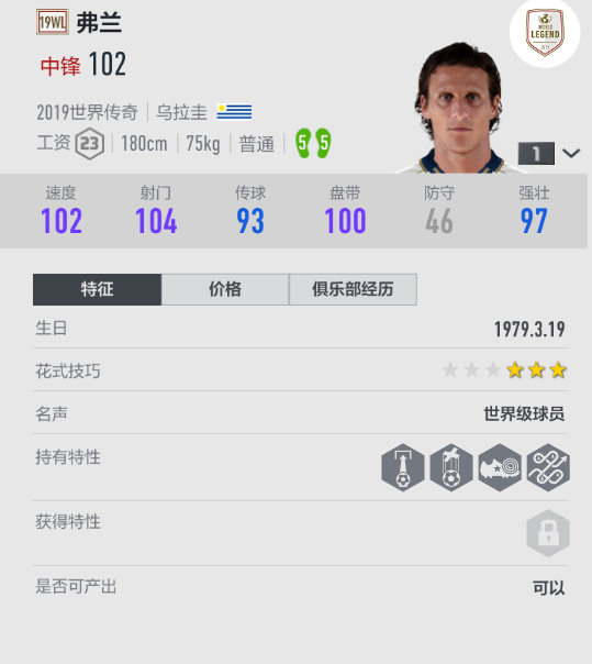 前不久刚退役的传奇前锋弗兰职业生涯效力过国米、马竞、曼联等球队。弗兰在10年南非世界杯的舞台上给人留下了深刻的印象,他的超远距离射门能力令全世界球迷叹为观止。19WL弗兰凌空抽射、远射、射术都在100以上,同时双五脚,左右开弓,能更好的把握凌空抽射的时机,提高进球率。