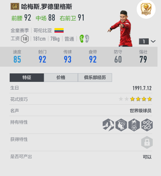 14年世界杯上的凌空抽射让全球的球迷认识了这位阳光帅气的哥伦比亚人,那粒胸部停球,半转身的凌空抽射震惊四座,最终也被评选为那届世界杯的最佳进球。游戏中同样给了哈梅斯凌空抽射的高能力值,NHD和GR赛季的J罗都可。想要在游戏中复刻完美进球,快入手J罗试试吧~