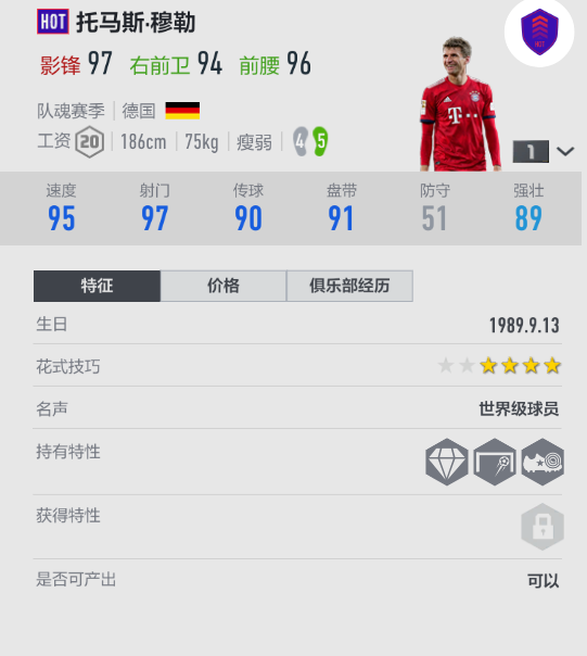穆勒有着全面的进球能力,在前场的任何位置,他都能嗅到最好的射门机会。HOT赛季穆勒有外脚背射门和善于搓射的特性,这两项能力都能更好的辅佐穆勒完成凌空抽射。
